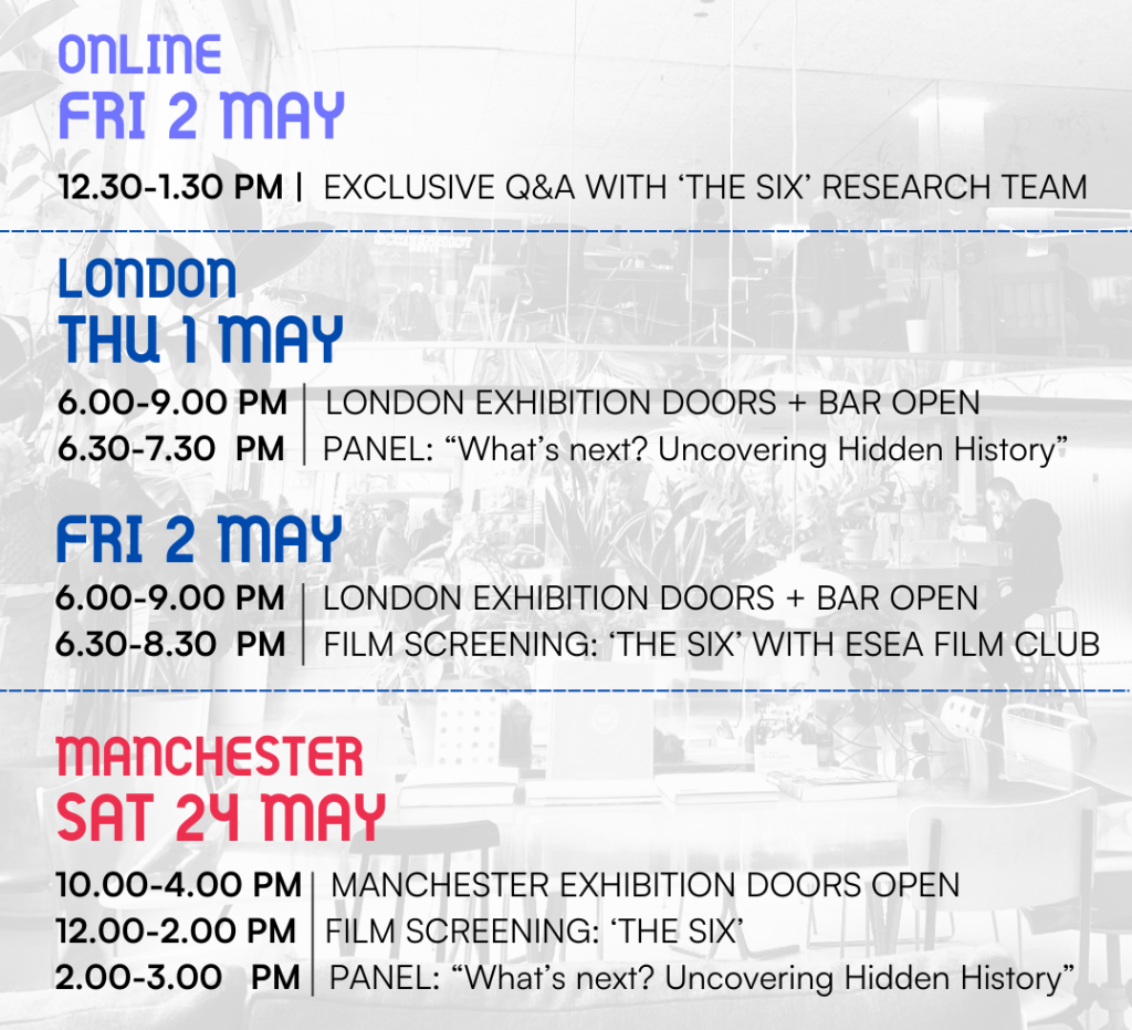 Join us on 1-2 May at Second Home in London and 24 May at SEESAW in Manchester for our exhibition to find out and learn more! This events include the stories of the Chinese passengers and more from across the British ESEA diaspora and histories spanning centuries, panel discussions with experts on cultural heritage and history talking about what’s next in uncovering hidden history and actively broadening understanding and retellings of it, and screenings of The Six documentary. There is also an exclusive online Q&A on 2 May with Steven Schwankert, Arthur Jones and researcher Clotilde Yap, available to all ticket holders. We hope to see you there!